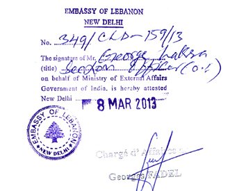 The Neral issued Birth / Marriage / Diploma / Degree / Affidavit / PCC / Commercial Exports documents will Attestation from Lebanon Embassy/Consulate after the Attestation of the respective officer designated by the MEA, Government of India. The designated officer or signatory or the department can be change from time to time as per the order of Ministry of External Affairs. The respective signatory can be the Commissioner, Deputy Commissioner, Section Officer, Magistrate, SDM, Chief Secretary, Joint Secretary Etc…